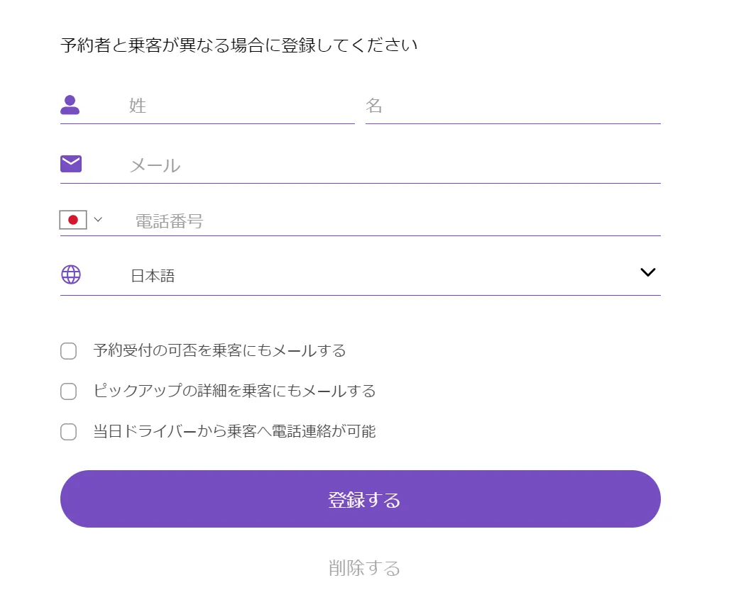 予約時の最終確認画面に下記のリンクがございますので、ご乗車される方の情報をご記載ください。(下記「ご乗車される方の情報のご登録」をご参照ください)