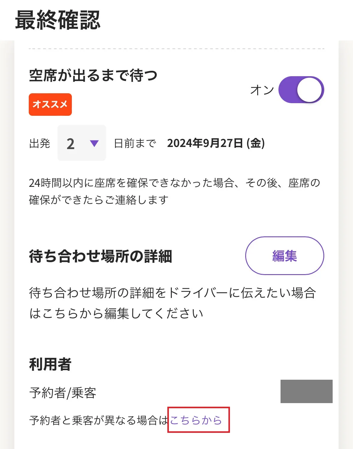 ※ご乗車されるの方の情報を変更ご希望の場合はチャットにてオペレーターまでご連絡をお願いいたします。その際には6桁の予約番号を合わせてお知らせください。