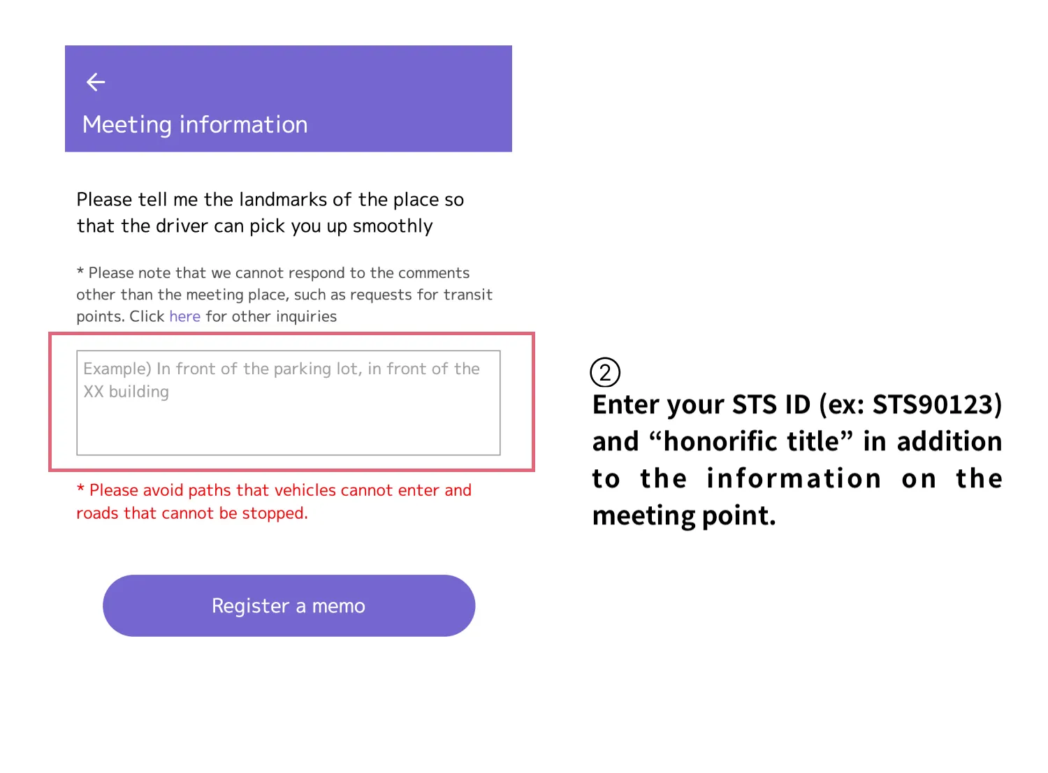 ② Enter your STS ID (ex: STS90123) and “honorific title” in addition to the information on the meeting point.