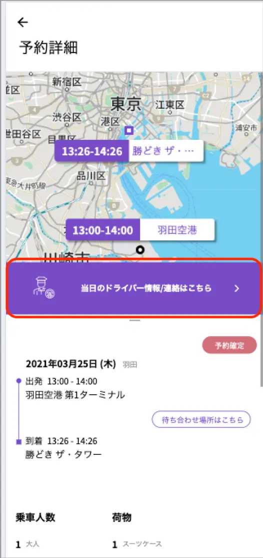 ④予約詳細ページの中の「当日のドライバー情報/連絡はこちら」をクリックして、ドライバー情報ページへと移動します