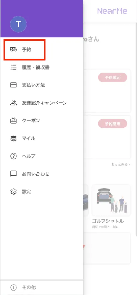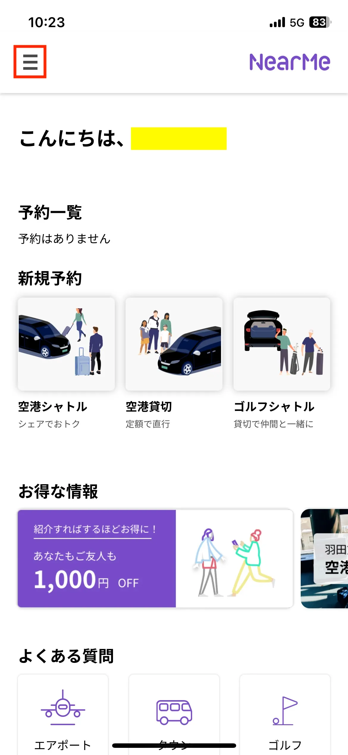 ①ニアミーのアプリを開き、左上のハンバーガーアイコン(赤枠の部分)をクリックしてサイドバーを開きます