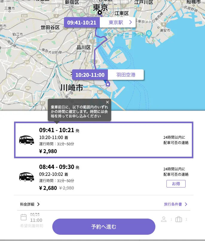 11:00着になるとフライトに間に合わないという場合は、一つ前の画面に戻って時間を10:45着にする等の対応をお願いいたします。
