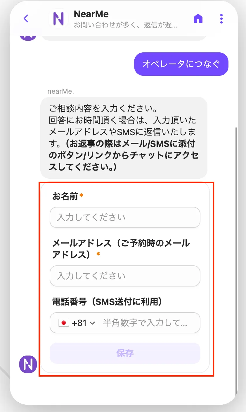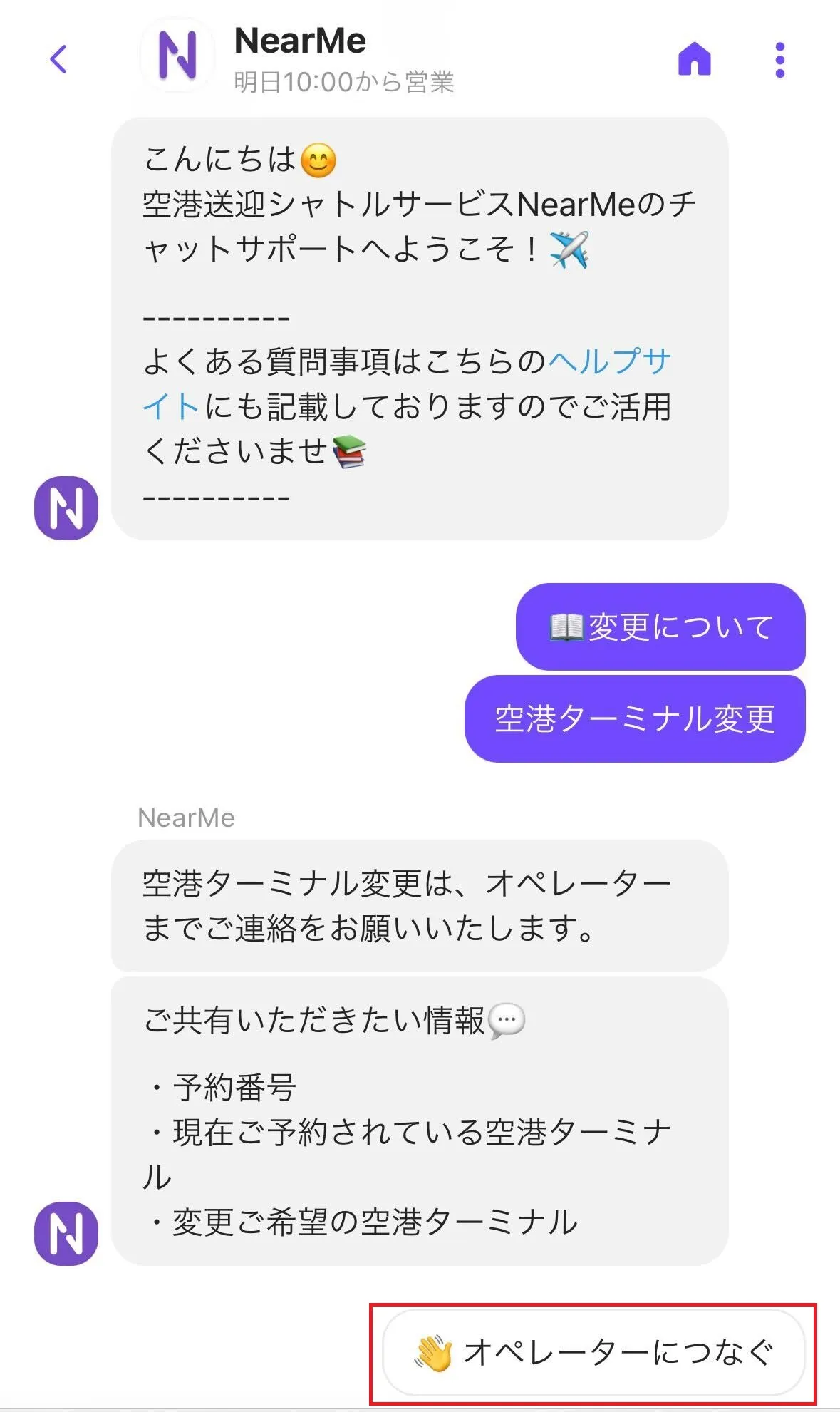 チャットの進み方:変更について>空港ターミナル変更>オペレーターにつなぐ