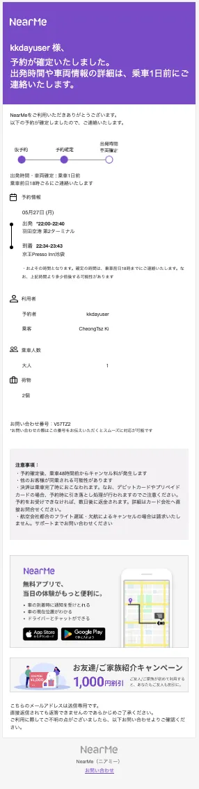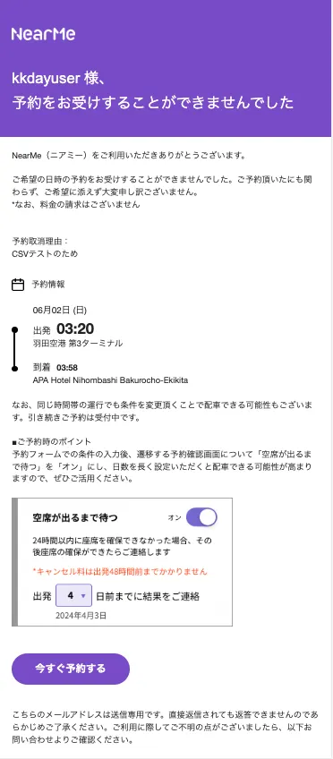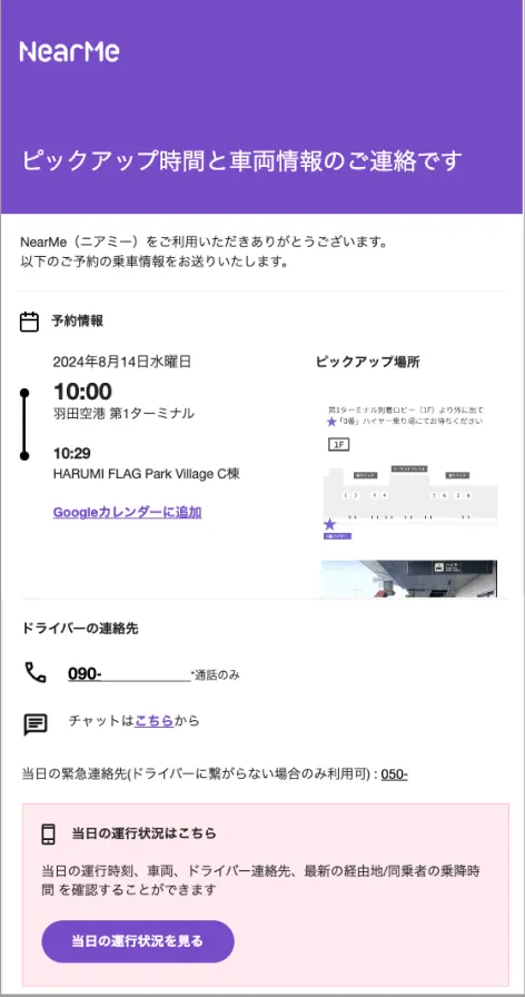 ②乗車時間が確定した際は、ご予約時に登録されたメールアドレス宛に、車両確定メールを送らせていただきますので、ご確認ください