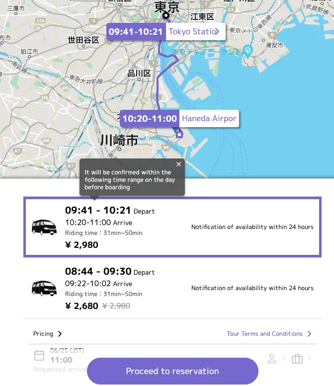 The sending time of the "boarding time/vehicle confirmation email" will vary depending on the boarding time. We will inform you on the reservation details screen of the email/app.