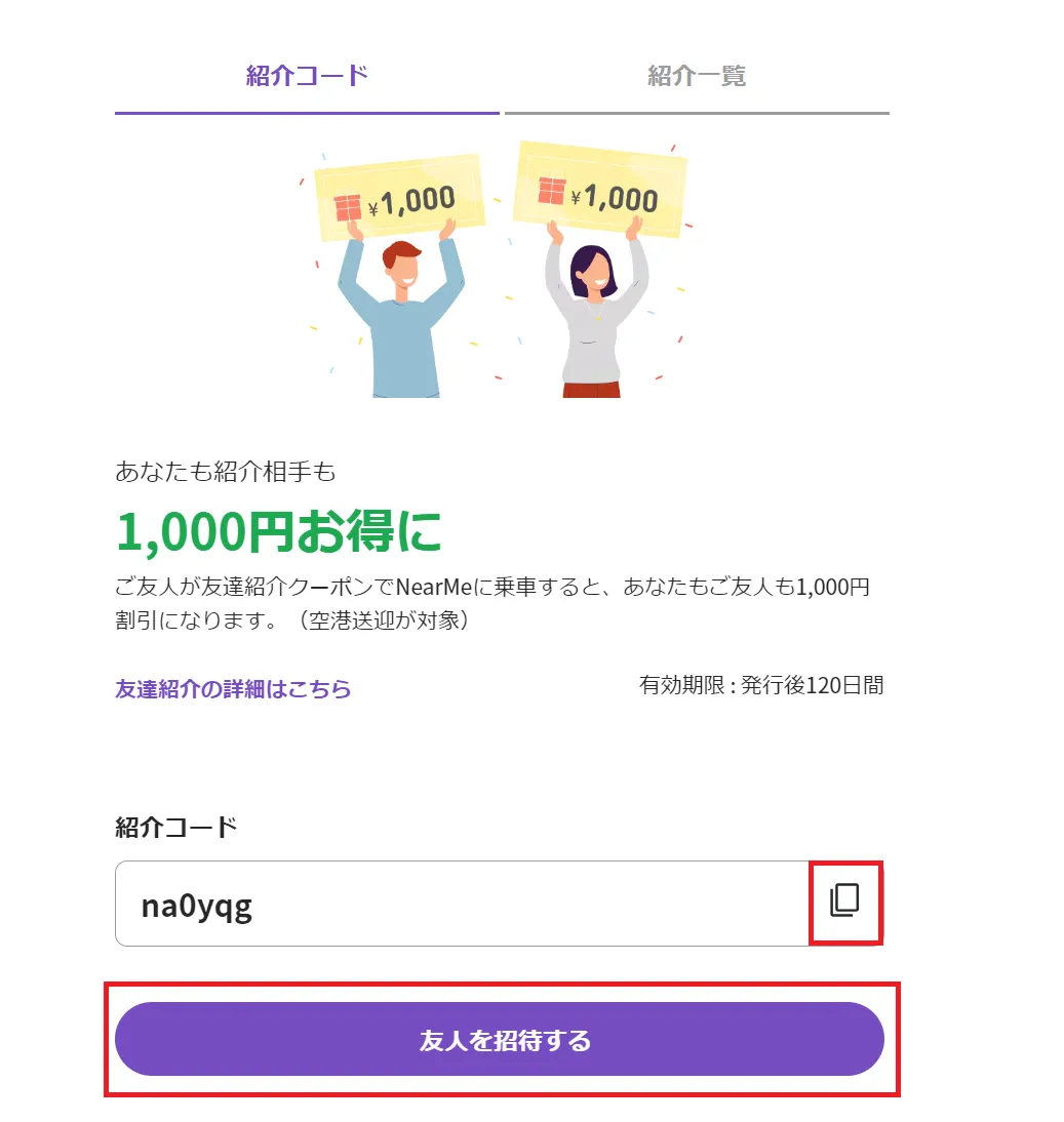 友達紹介ページに移動し、紹介コードの右側にあるコピーボタン、または「友人を招待する」のボタンをクリックして、紹介コード・URLをご友人に送付してください。