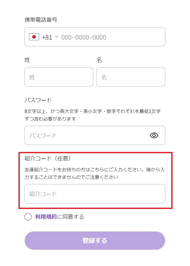 紹介者から送られた紹介URLから進むと、紹介コードが自動的に反映されます。